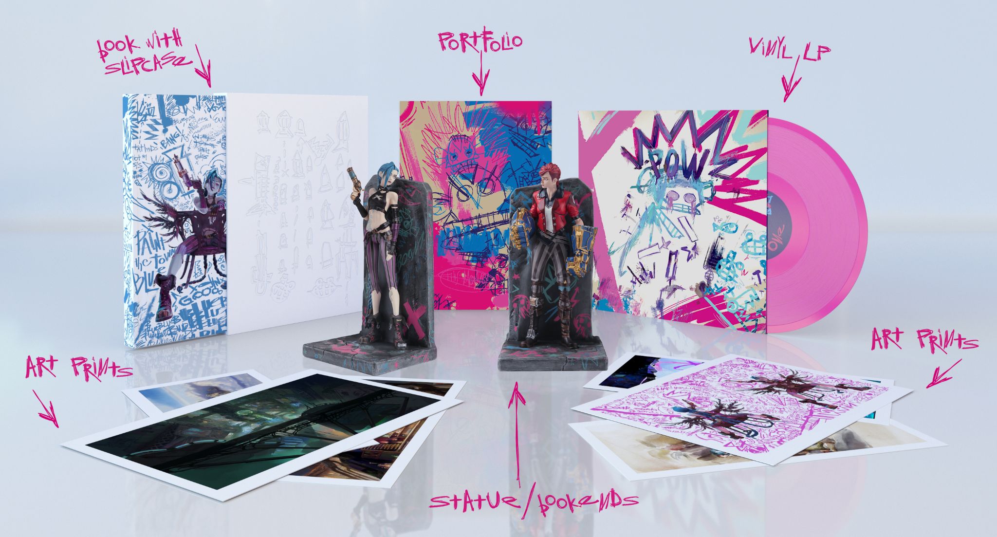 - Two stunning, high-quality, ~9″-tall, hand-painted polyresin bookend statues of Vi and Jinx