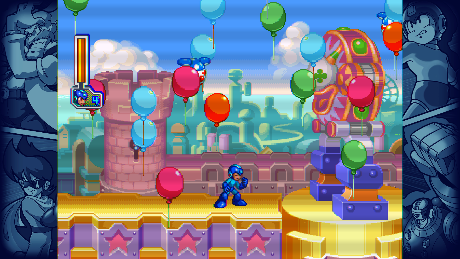 Mechanically, however, Mega Man 7 draws inspiration from its X counterparts. Finding a few hidden powers or Rush parts neatly tucked inside levels returns, as does a suite of special abilities. Meeting up with Proto Man in Cloud Man and Turbo Man’s stage leads to a hidden confrontation inside Shade Man’s level, earning Mega Man Proto Man’s coveted shield. Finding all of the R-U-S-H letters reissues Mega Man 6’s Super Adaptor, and the Energy Equalizer is tucked away in inside Shade Man’s stage. Only Rush Search, where Rush is summoned to sniff out currency bolts or extremely hidden items, feels like a gimmicky waste of time.