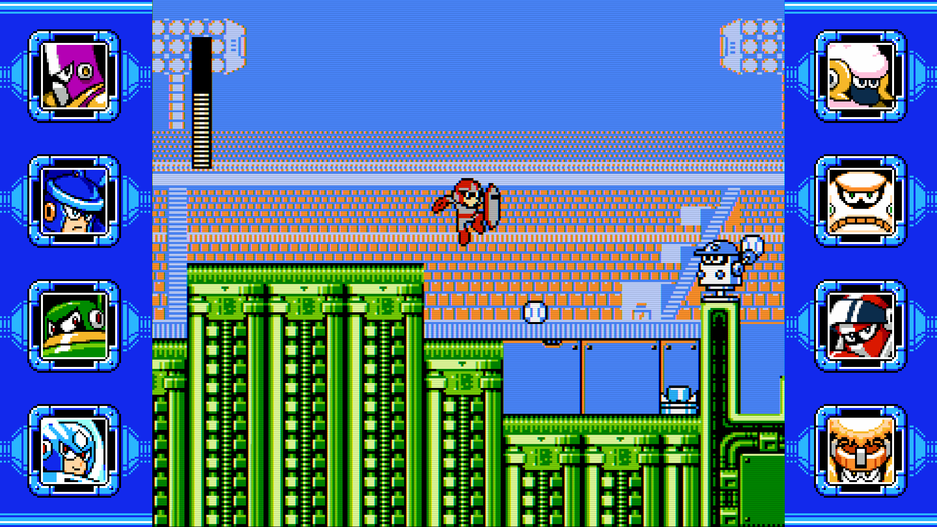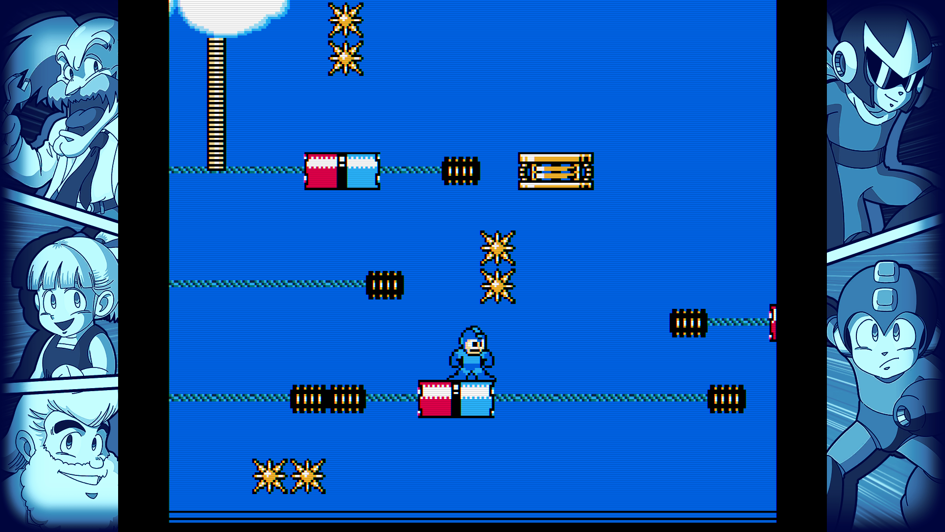 There are other instances where creativity clashes with repetition. Clown Man’s stage is ripe with background toys that affect the foreground. Astro Man’s stage contains two legitimate mazes with switches and doors. One of the more forward-thinking segments is found in Sword Man’s stage, where Mega Man must complete four tiny puzzle rooms to lift four gates. Only Aqua Man’s stage, where Mega Man’s price control is stripped in favor of a sloppy swimming mechanic, seems to go off model.