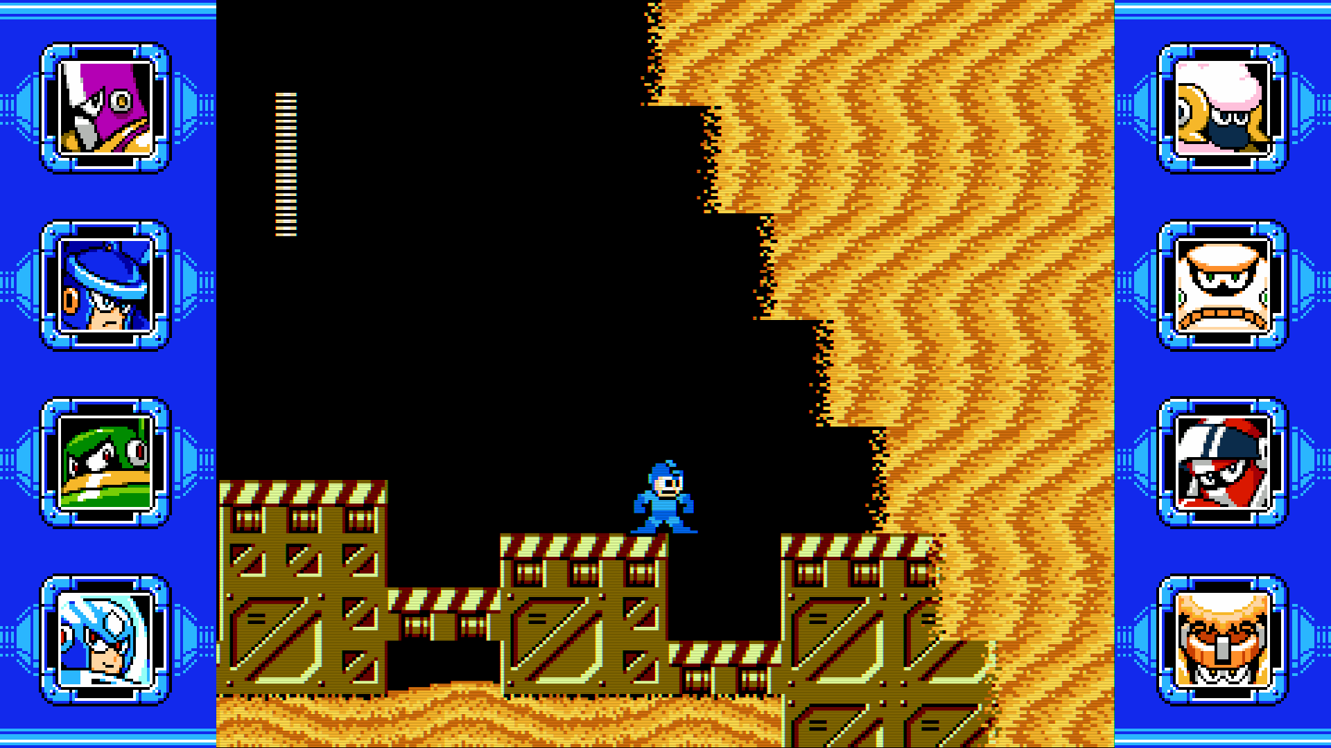 As expected, each stage has its own thematic gimmick. Pump Man’s drab colors and slime shooting Mets relive the thrill of travelling in a dank sewer. Chill Man introduces breakable ice platforms and Nitro Man deploys homicidal buses. Commando Man’s screen encompassing sandstorms walk an unstable line between skill and luck, although at least his sand theme makes more sense than Sheep Man’s sentient mouse cursors.