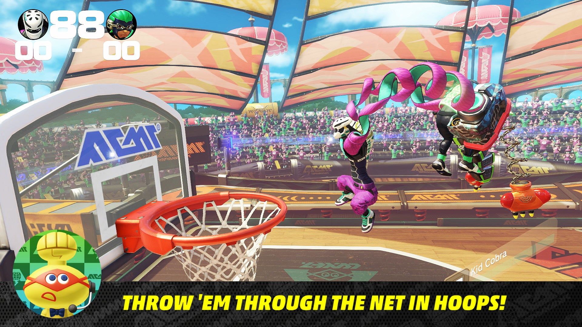 That said, there are a handful of ways to play ARMS right now, the primary solo mode being the Grand Prix. This mode is like your traditional arcade mode that pits you against the other ARMS characters in 1v1 battles that get increasingly harder. You can play in two player mode too, although I wasn’t able to test this. A potentially critical missing component to Grand Prix mode though is that there is no story, it’s just a series of battles with sports-like mini-games mixed in that have you playing a dangerous game of volleyball (spoiler: the ball is a bomb, mode is call V-Ball) or basketball (Hoops) in which you have to throw your enemy into the hoop for points. There is also the Skillshot mode in which you have to smash targets with speed and accuracy. Depending on your starting difficulty setting — and if memory serves there are seven levels of difficulty to choose from — the fights in the back-half of the Grand Prix can provide a stout challenge.
