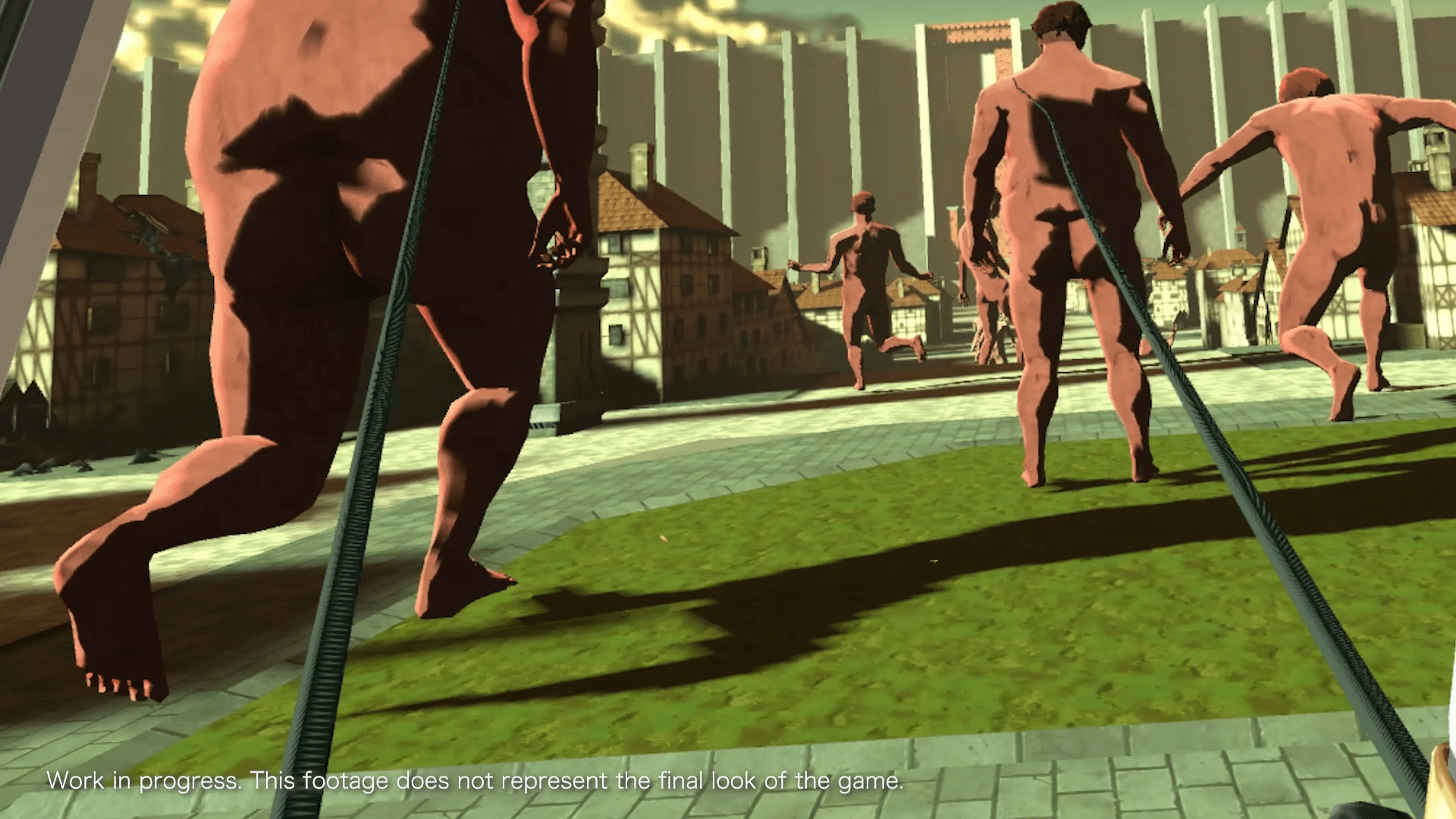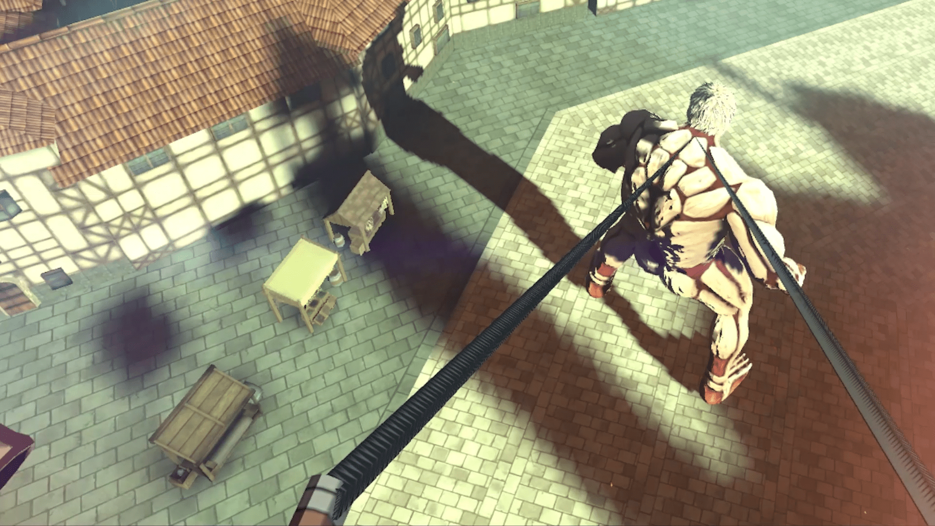 I was immediately placed into the shoes of a new recruit of a military group that fights Titans, gigantic naked humanoids who eat humans and cause destruction. Using “Omni-directional mobility” (ODM) gear, I was to make my way through the Walled City and slay every Titan in my path. The ODM gear is like a pair of jet-powered grappling hooks. By aiming the Quest’s controllers at separate buildings, I could essentially swing from building to building like Spider-Man but restricted to snap-turning (turning incrementally rather than smoothing).