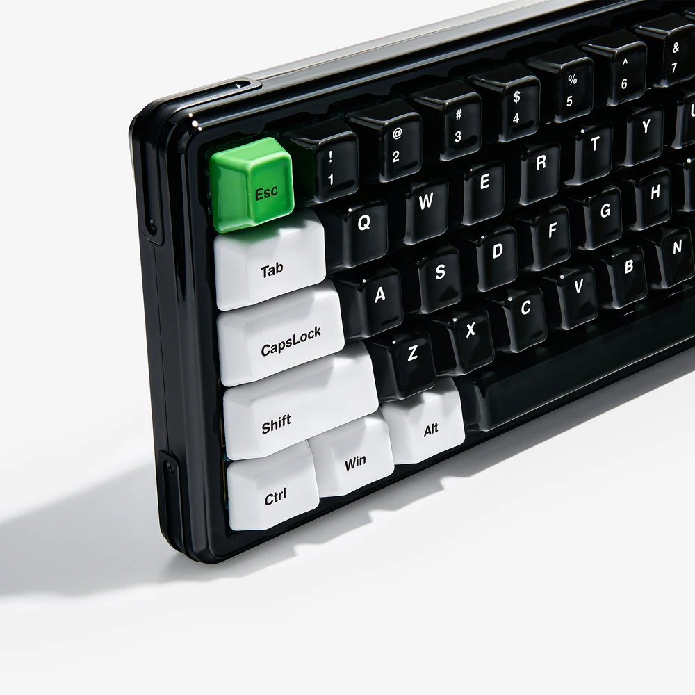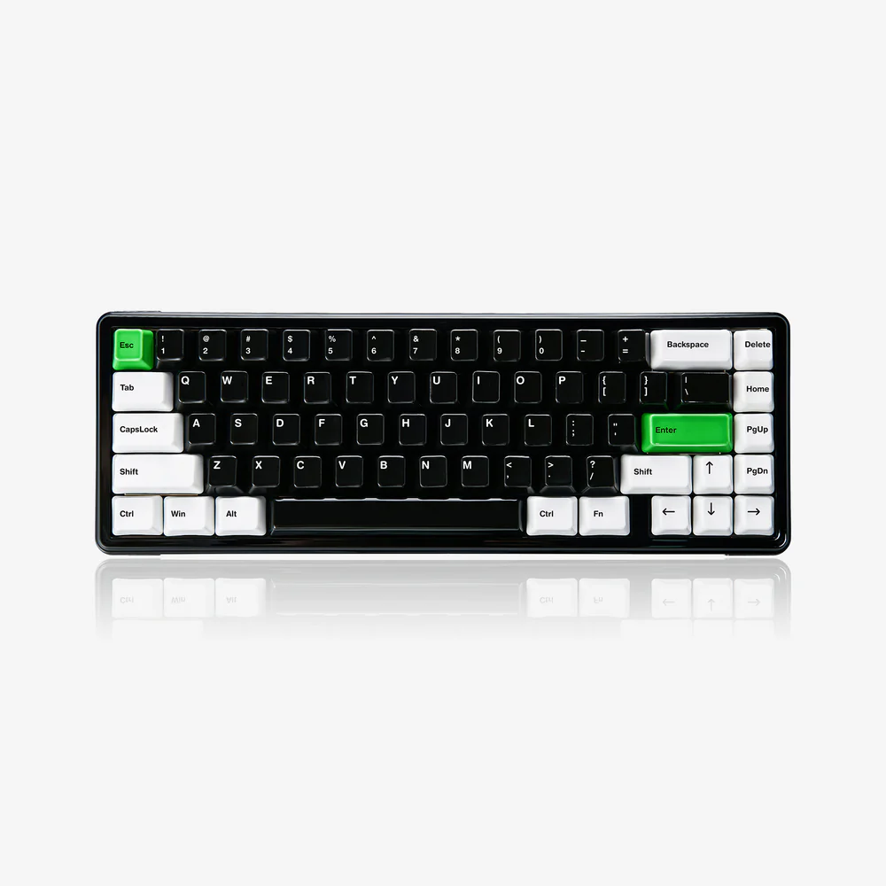 The Nada 65 Panda is the first mechanical keyboard made and offered by the Cerakey crew, and it’s a stunner. It’s beautifully designed to highlight the panda aesthetic of white, black, and green, all the while highlighting best acoustic elements that ceramic keycaps can offer. It’s a 65% keyboard, meaning that it’s relatively small thanks to the lack of function keys (no F row) and no numberpad. But, it has the essentials – it has your alphanumeric keys (in black), arrow keys and modifiers (e.g., delete, PgUp, PgDn; in white), and the escape/enter keys are in green. It also comes with additional Panda-themed keycaps that can be swapped out if you want to add some additional imagery to your setup.
