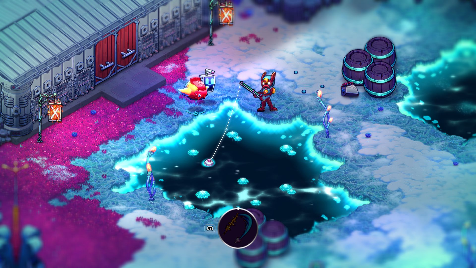 It’s cozy – delightfully so. The laidback alien atmosphere was perfect for some mindless farming, building, mining, and fishing. In the grand scheme of Crashlands 2’s gameplay, the combat ended up being just as simple especially when I had acquired new armor and slightly more powerful weapons. Alien enemies clearly telegraph their attacks, and when/if I died, a wacky inflatable arm flailing man would emerge on my corpse and retain everything I had collected.