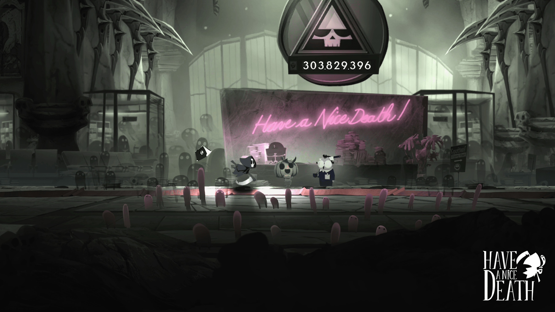 At this point, you’re probably wondering about Have a Nice Death‘s story. In between runs, I could wander around the small Hall of Eternity and the CEO’s Office to speak to some of the NPCs, occasionally advancing a small story taking place (like a Halloween Party, “ugh“). Death would rarely be amused by his employees’ antics, often expressing annoyance and disbelief at their silliness. While these small stories and interactions would slowly-but-surely advance the story, I found the drip-drip-drip storytelling to pale in comparison to the likes of Hades and RETURNAL. In between runs, I wanted something to intrigue me, something to interact with, and what usually awaited me was some small lines of dialogue and nothing more. These dialogue bits hit home really well, though, mocking the futility of the 9-5ers’ anthem and corporate culture run amok. The humor interwoven into Death’s conversations with his employees works to add life to the otherwise dreary office space. Some of you may find these in-game conversations familiar, while others may need to be informed that working spaces can very much be boring to the point of seeking conversations with other coworkers around a partially functioning coffee machine.