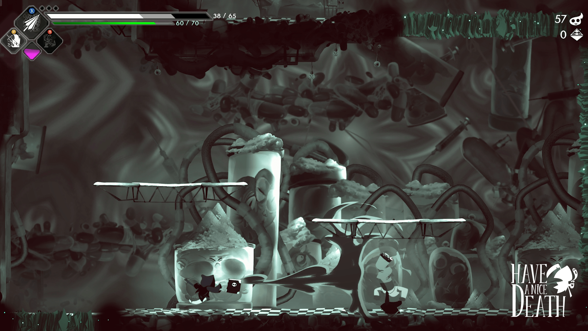 Some departments felt more alive and colorful than others, however. While there could be a thematic justification for that, I ended up preferring to run through the Toxic Food Processing Department and the Physical Illness Departments only because of their contrasting colors and unique ambiance compared to the rest of Death Inc. Either way, having that choice to avoid one Department entirely made me feel as though I was sidestepping more difficult/annoying sections. Interestingly, I learned from the developers that some levels may have hidden rooms. It wasn’t until over 10 hours in when I saw the blink-and-you-miss-it hidden room indicator, and I only encountered a hidden room but a handful of times. It would have been nice for an additional tutorial/in-game reminder to keep an eye out for the secret content, especially since they’re so rare to begin with.
