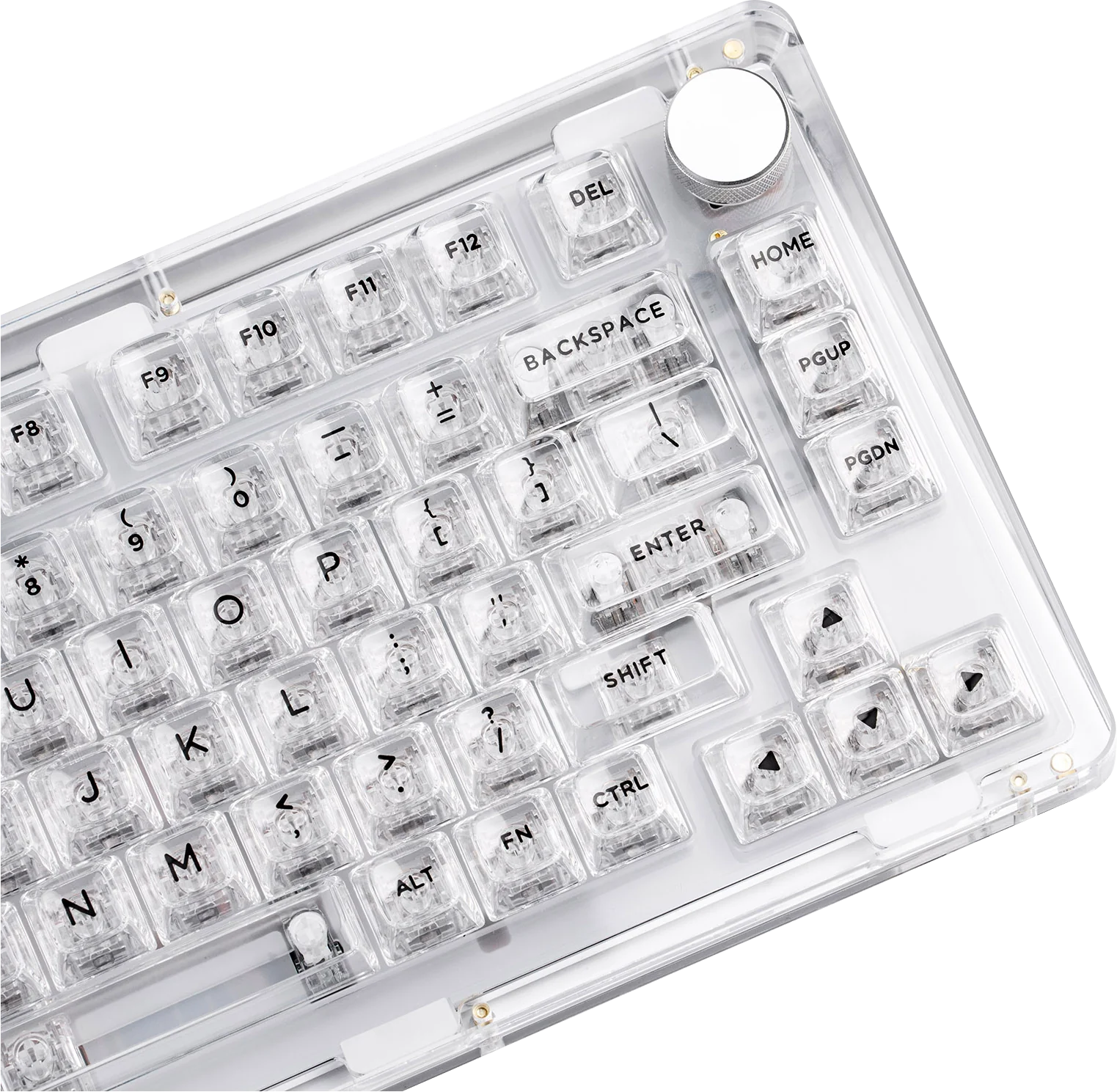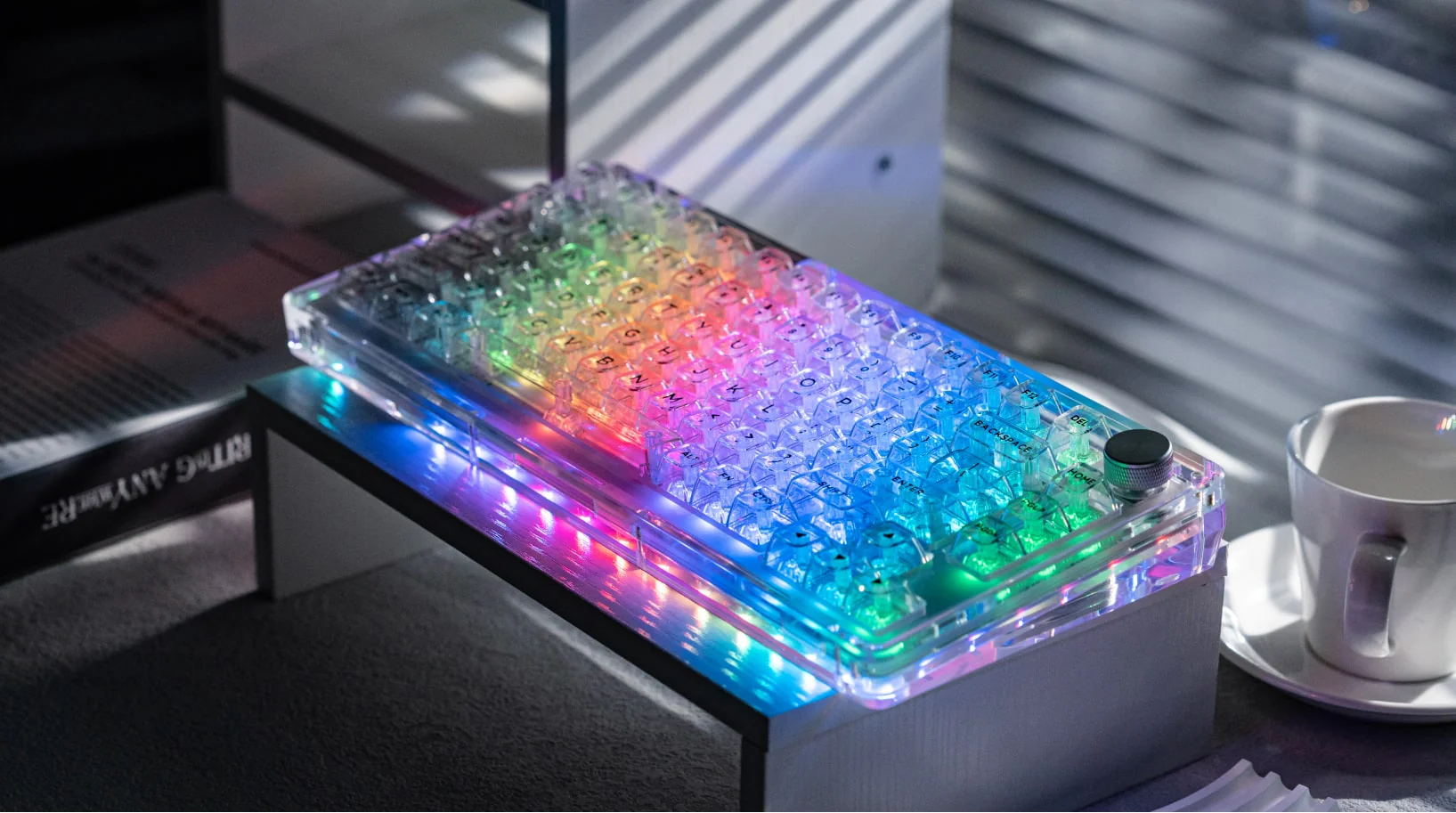 Just about everything on the keyboard is transparent, spanning from its acrylic case, its crystal switches (unique to KiiBOOM), and its keycaps. The crystal keycaps are a variant of the SA profile keycaps (KiiBOOM calls them “ASA”) that look similar to Cherry MX style caps but are far taller, rising above the keyboard frame to look as through they’re resting on the frame rather than being embedded within its acrylic housing. With everything being crystal clear, the keyboard lights up in every direction, be it under the clear switches to the side of the keyboard, too.