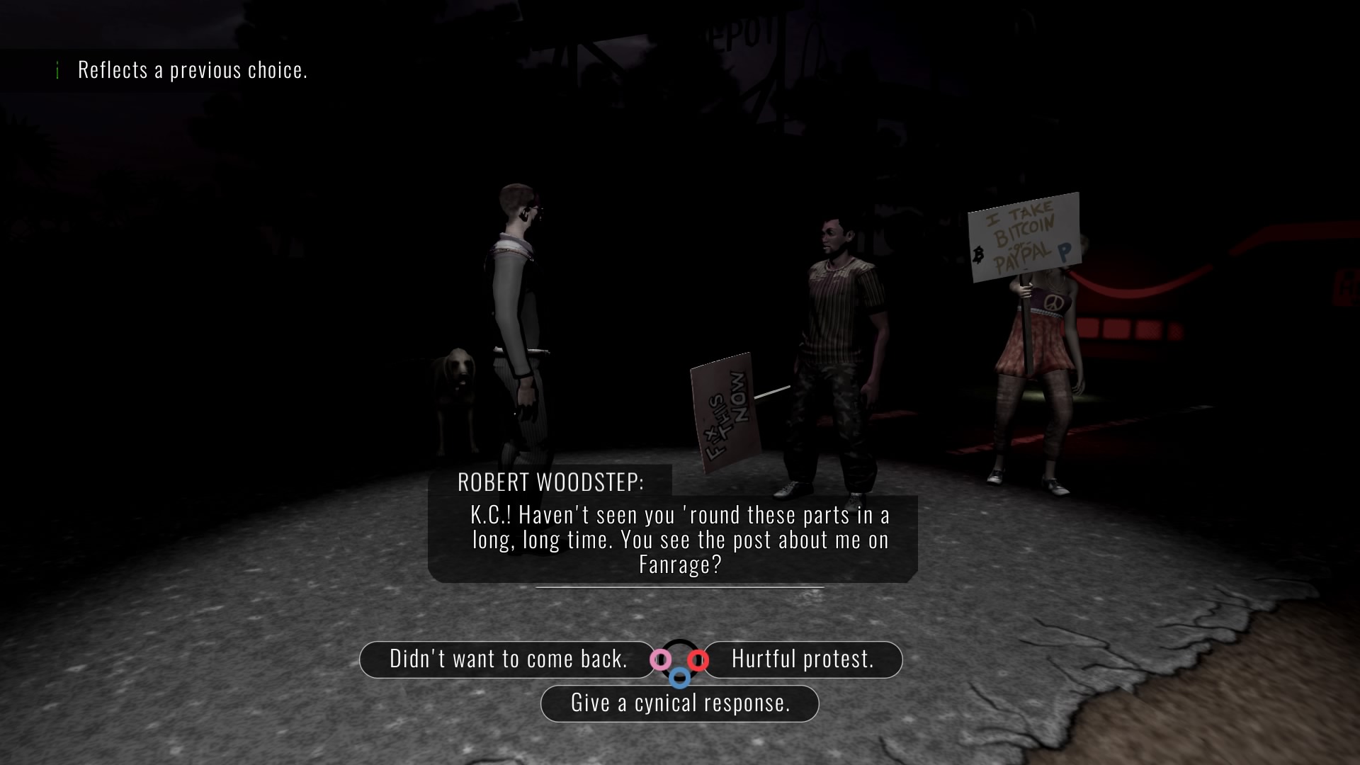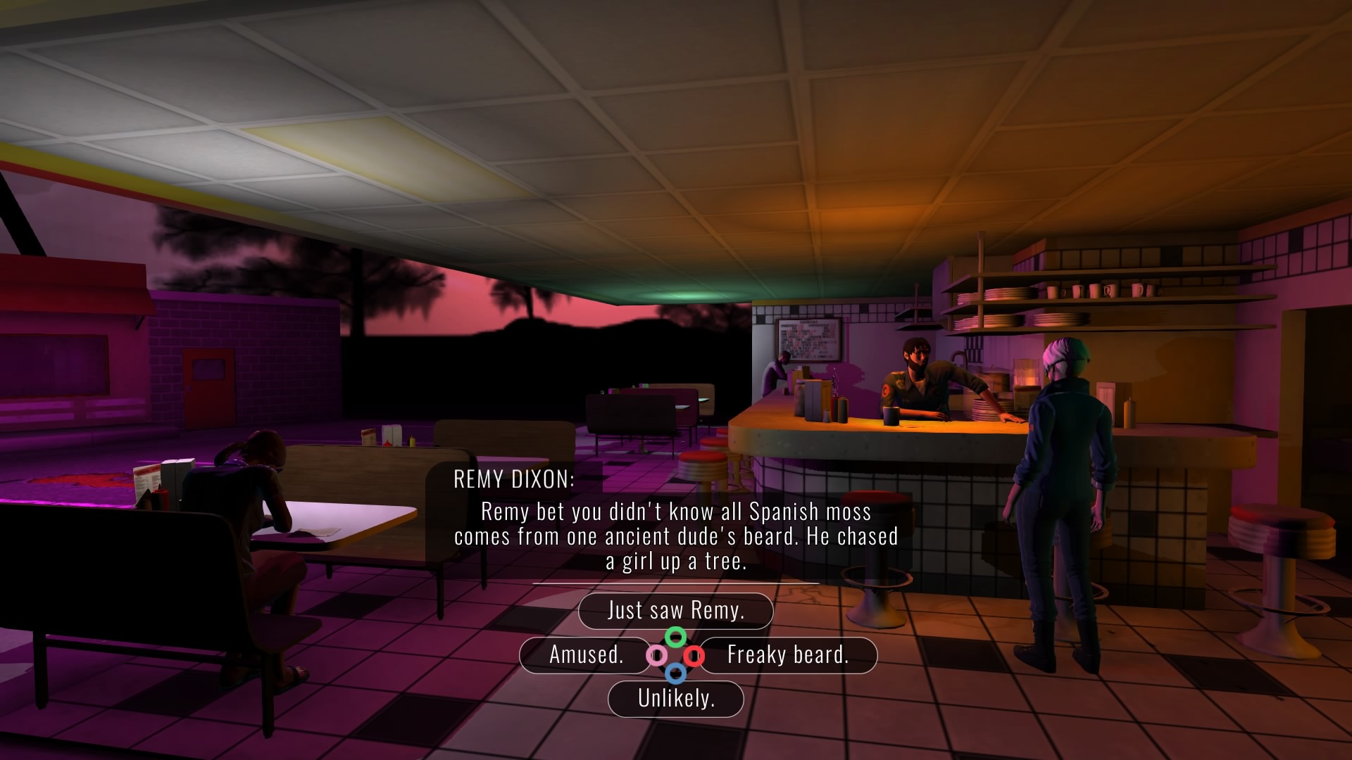 None of it matters. That Knee Deep is fixed to a rail with minor variances isn’t necessarily an issue, Telltale’s The Walking Dead, Oxenfree, and even Firewatch get away with the same thing; my problem is that Knee Deep is thoroughly unconcerned with its own characters. When it comes to dialogue selection, there’s always an inquisitive option to drive the plot, an observation about the environment, and one that is complete transmission-jamming nonsense. Ironically, the latter is far more serving of Knee Deep’s characters.