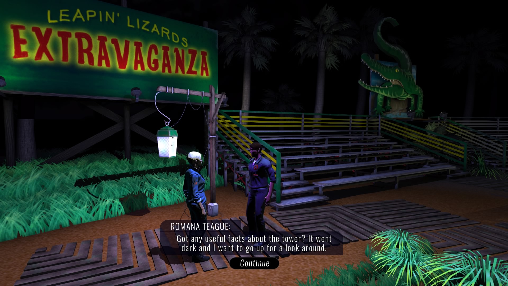 An inability to focus on one specific style is the center of Knee Deep’s problems. A small town with a dark history suggests an allegiance to Twin Peaks, as do outlandish characters with unreadable motivations and figurative, casually weird dialogue. Floridian bogs and swamps with rampant gator issues, however, are no match for the ethereal splendor of the Pacific Northwest. Further, games like Virginia and Kentucky Route Zero understand that they can’t just be weird for the sake of being weird or rely on the peculiarity of their setting to create supernatural tension. These facets are fun to indulge in, but ultimately operate as a support system for a greater narrative. Knee Deep, on the other hand, is entirely devoid of subtlety, and its surreal elements fail to leave an impression inside of a subconscious mind.