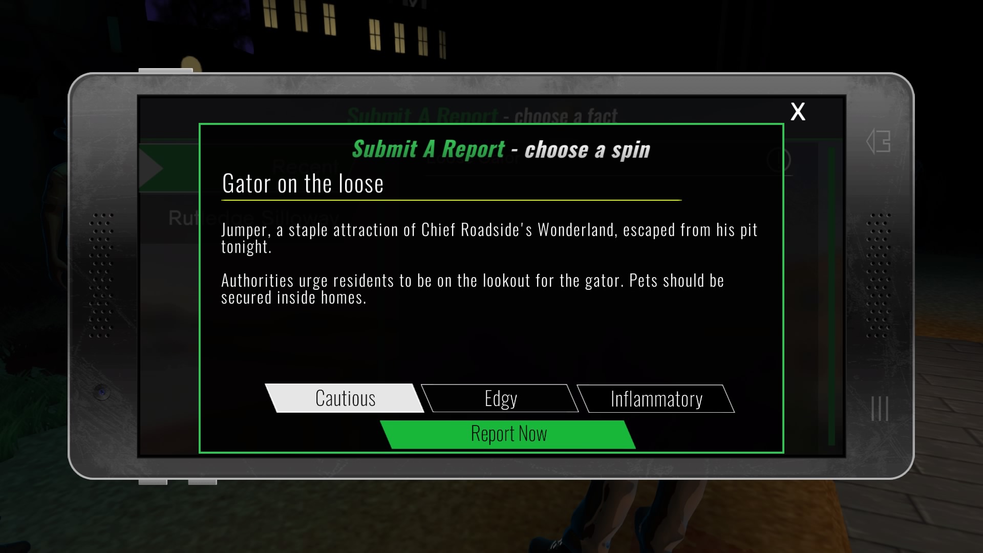 Knee Deep’s signature (and most interesting mechanic) is how it allows the player to frame and develop its plot. Speaking with the denizens of Cypress Knee and asking the right questions churns out juicy pieces of information. Each character is indebted to their employer for new stories, and the player can choose to compose it as cautious, edgy or inflammatory. This calls for a bit of personal role-playing; how would Teague, a young blogger writing for a gossip rag and desperate for legitimacy, report an insurance scandal hacked out of Kern’s computer? What kind of story would Jack write about an escaped gator wreaking havoc on the town?