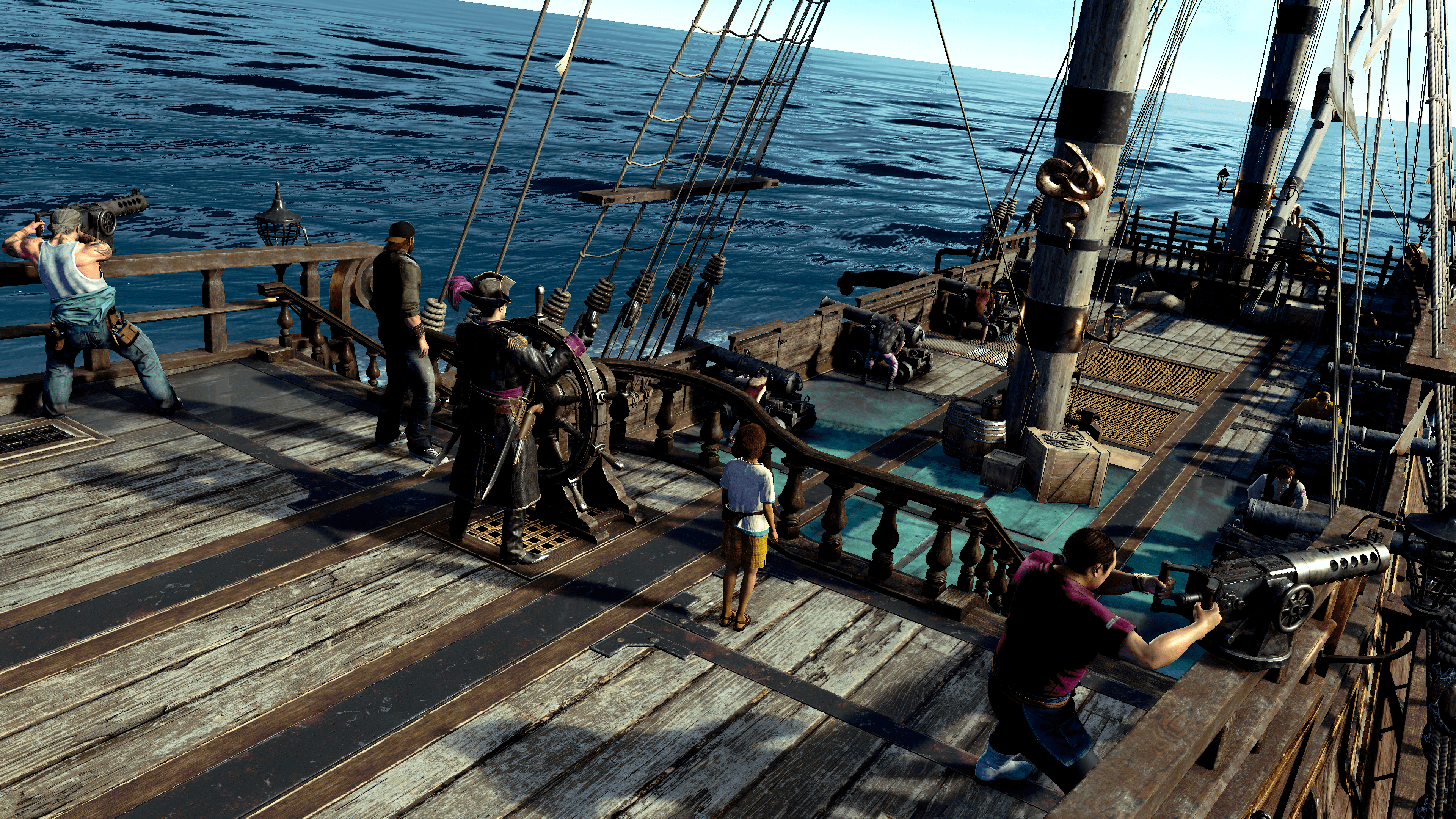 The naval battles are fun, but they took a degree of onboarding to truly appreciate using machine guns, managing my crew when they had sustained critical damage in battle, and navigating choppy waters. While most battles concluded once I had successfully sunk every enemy ship in sight, the bigger and meaningful battles would involve me hijacking the enemy leader’s ship and fighting them on the deck with a pirate crew of my choosing. There’s a light degree of party management, but not enough to warrant needless hours spent at sea.