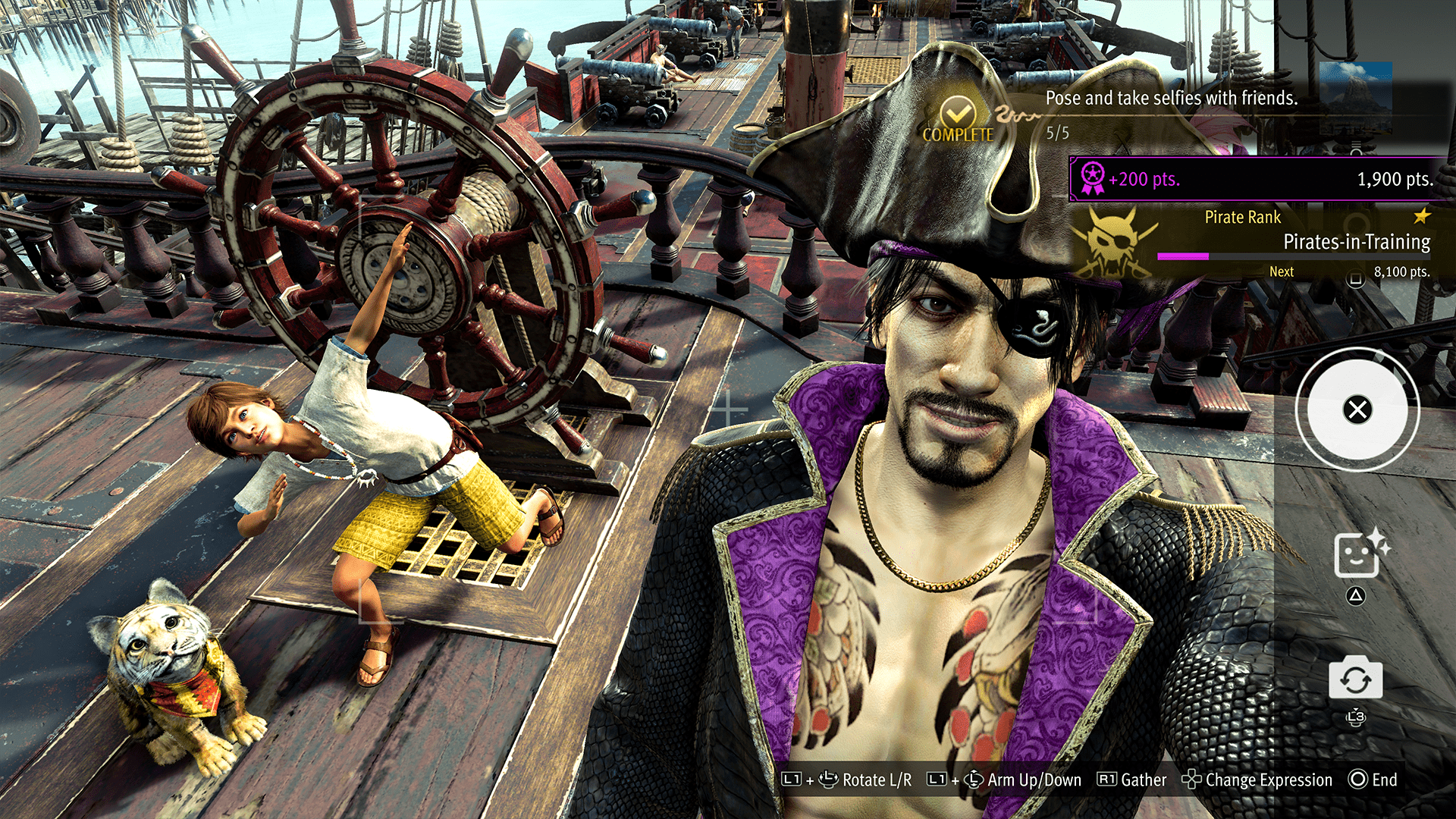 The first chapter is often the slowest in any Yakuza game. This go-round, I spent maybe half an hour getting to know the amnesiac Majima, Noah, Noah’s pet tiger Goro, and Noah’s family. I’m shown the ropes in a handful of battles that fly by, and the typical pseudo-serious expository cutscenes before I’m set free to explore the ocean on the Goromaru, Majima’s pirate ship. I’ll get to the pirate ship stuff in a jiffy – hold tight!