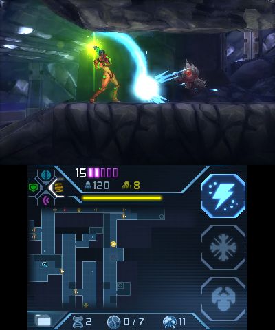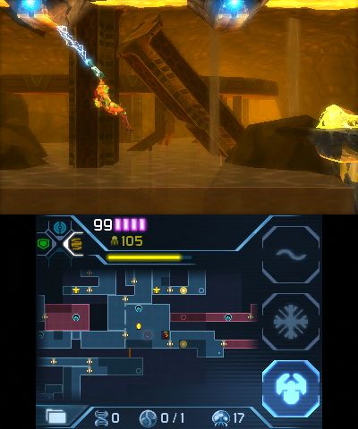 While Samus Returns does not use all of the buttons on the New 3DSXL (understandable to be compatible with the other DS systems), I felt more control-interaction while playing Samus Returns than about any other game I have played on the platform. You won’t use the stylus at all, but you do tap the touch screen to get into and out of your morph ball, although Samus will automatically go into and out of it under certain environmental conditions. Holding L is for precision aim while holding R switches to missiles, and pressing Y fires your weapon (be it the standard energy weapon, the ice gun, or wave beam) or missiles if you’re holding R. So at times, and in every metroid battle, you are holding L, R, aiming with the stick, and pressing Y to shoot, and possibly going in and out of morph ball and jumping as well. It gets pretty hectic, especially too when you add in pressing left on the d-pad to switch to Aeion-powered shields and then A to activate and deactivate them (they run the energy meter out pretty fast, so you can’t just leave them on). For me, it was fun and challenging, then sometimes for a short while frustrating, but then a lot of fun again.