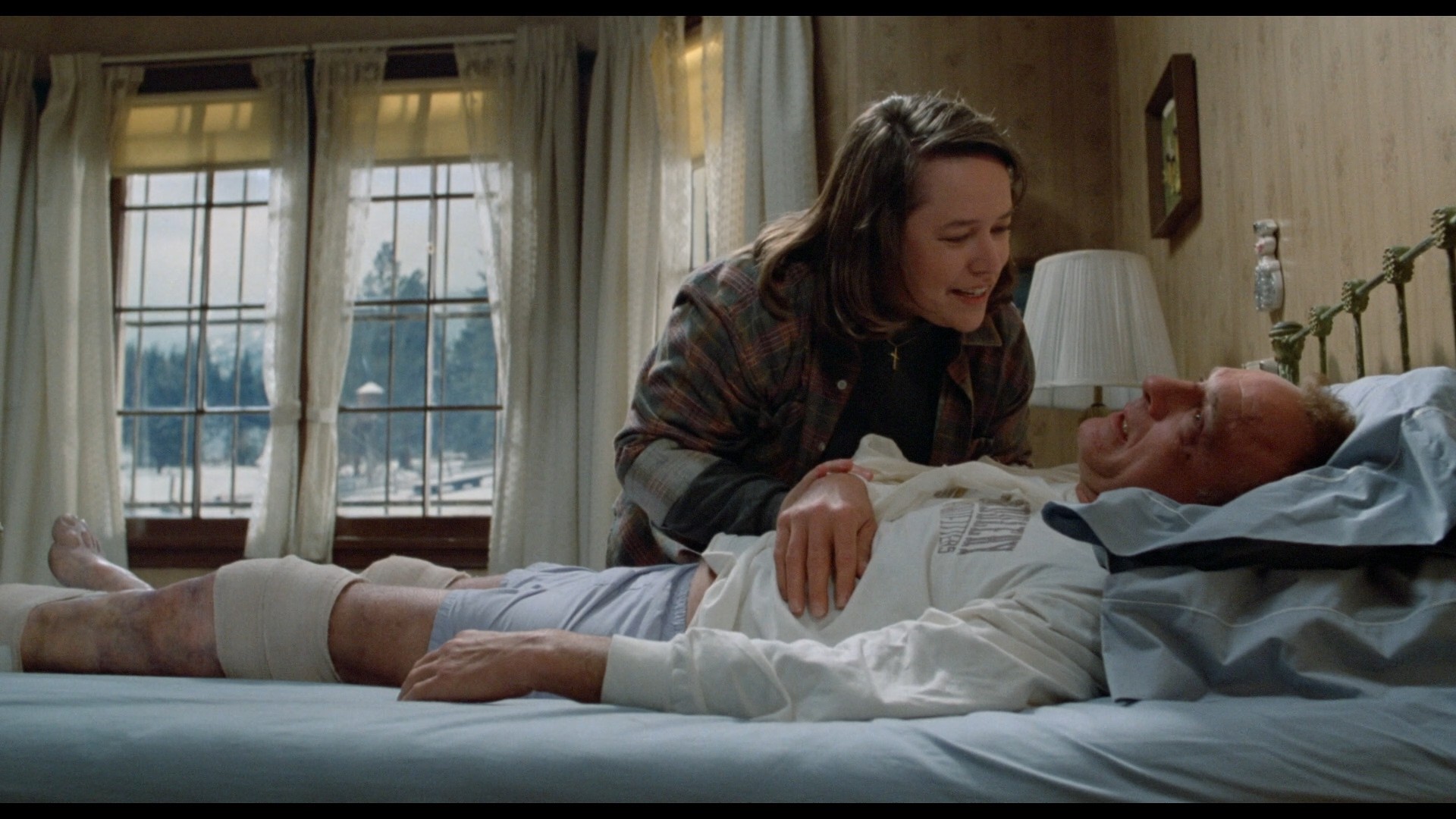 Misery is presented in 1080p High Definition Widescreen 1.85:1. The transfer is a new 4k restoration from the original film elements, and this looks absolutely fantastic. Color levels are well balanced, with a bit of a muted, washed-out tone blanketed by a bright and blinding snowfall. Grain is maintained at the original intended level, with no major defects noticed in the transfer.