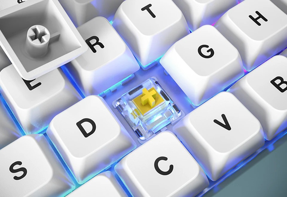 The G-PRO 2.0 switches differ in their tactility (Brown is tactile; Red and Yellow are linear), operating force (red requiring the least force at 45gf), and sound. The Yellows produce a low and slightly deep clackiness. When I would furiously mash the keyboard, it would get a little loud, but the Yellows (and Reds, too) feel and sound like a quietly smooth switch. Some of the acoustics can be attributed to the sound dampening silicone pads, but the Gateron G-PRO 2.0 switches are silky smooth and easy choices for office work and gaming.