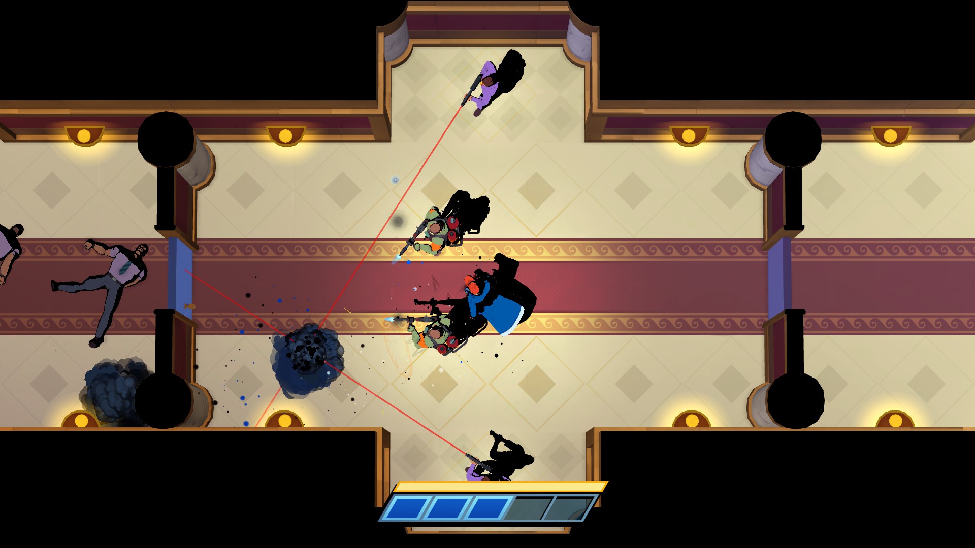 Increasing opposition is Mr. Shifty’s first order of business. Purple suited guys give way to burly melee-focused assholes with slightly more health. They’re proceeded by yellow-suited henchmen with automatic rifles. Quick ninjas with katanas, dual-pistol wielding foes with a ping-pong ability, red ladies with auto-shotguns, and green rocket launching brutes help round out the cast of carnage-obsessed lackeys. They’re rarely in short supply, which is a problem we’ll address shortly.