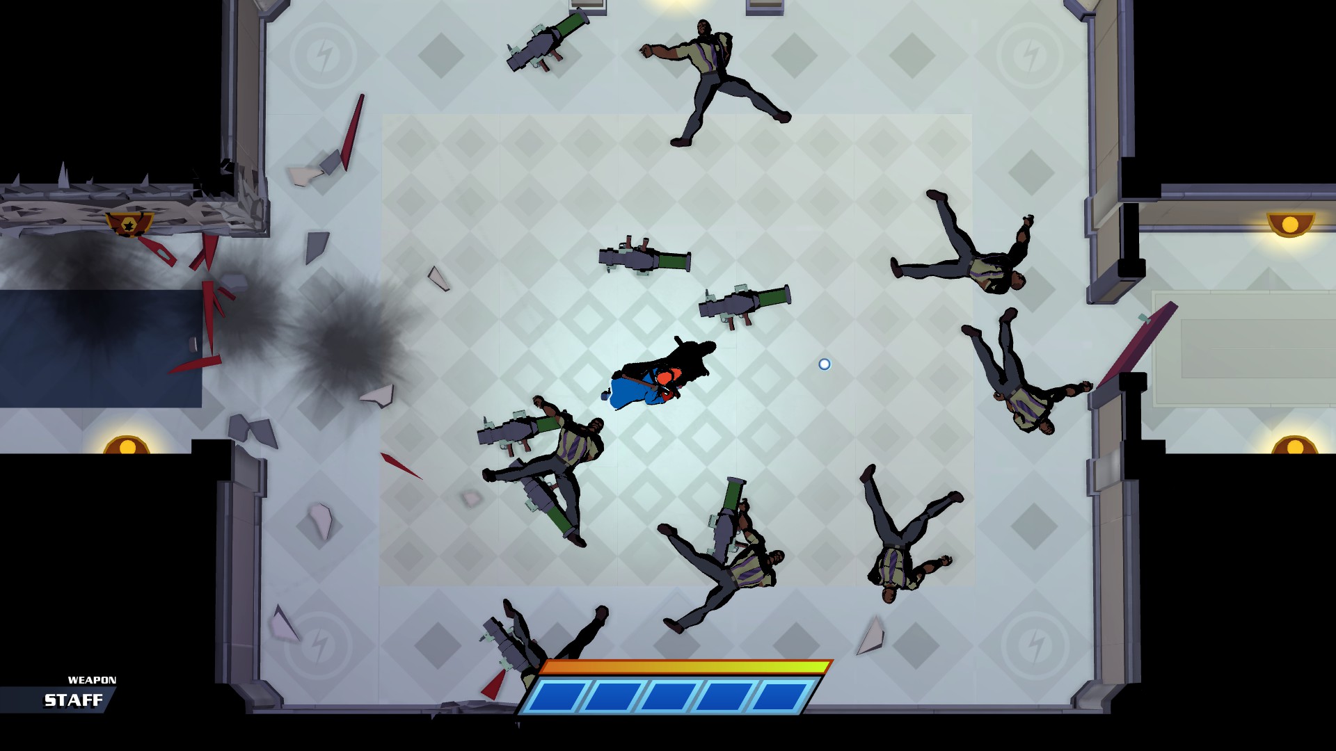 Mr. Shifty can teleport about five feet in any direction and deliver a one-two punch with his fists. He can pick up some objects—keyboards, brooms, miscellaneous staff-based items—and get one or two instant-killing punches out of them before they disappear. Many of the henchmen and henchwomen populating the tower will have guns, but Mr. Shifty does not use guns. It’s never explained why (other than the obvious point of it would break the game), but it’s fine. Fists are good. Projectile operation would push Mr. Shifty even closer to Hotline Miami, a sun we already flew too close to with Hotline Miami 2.