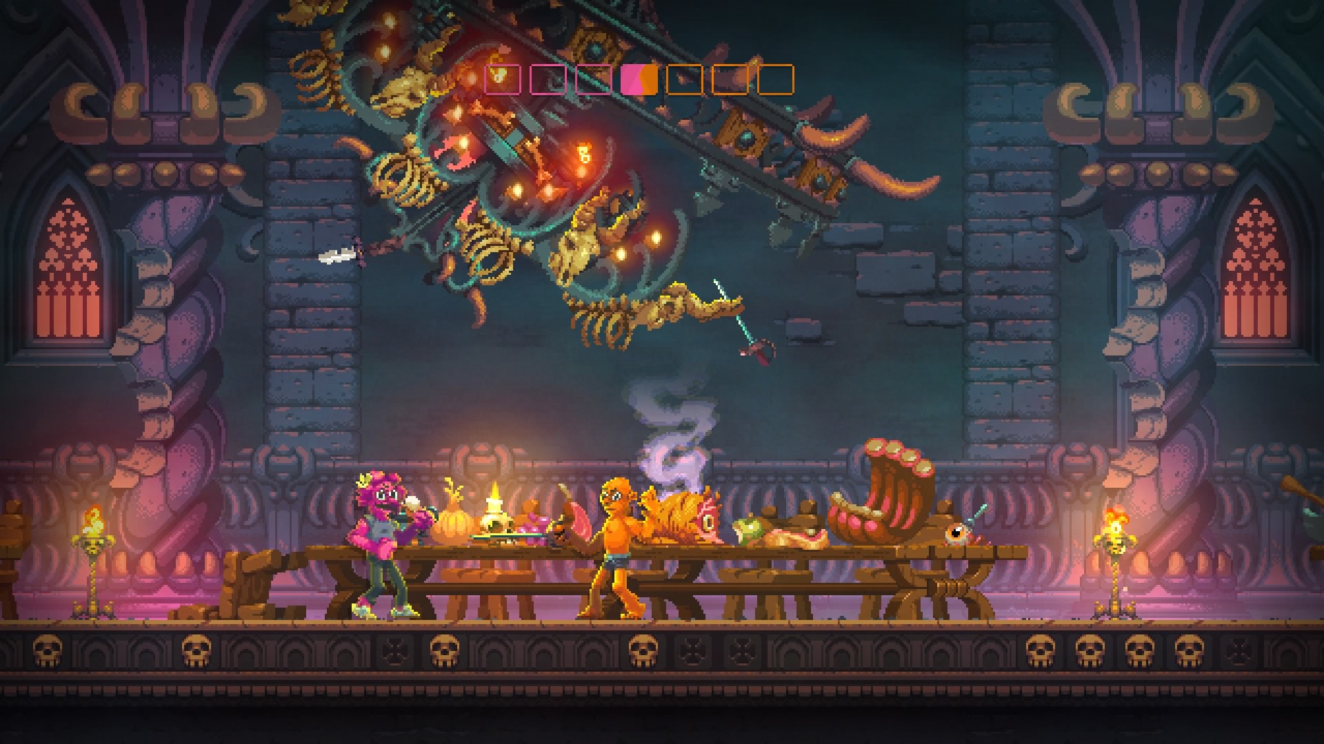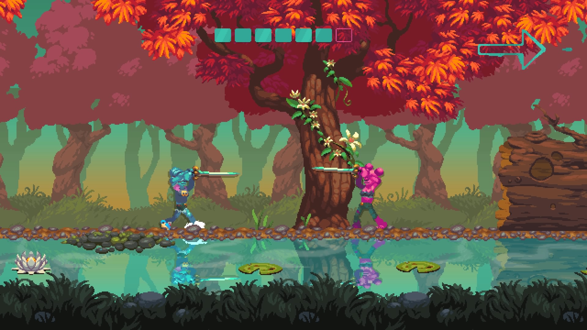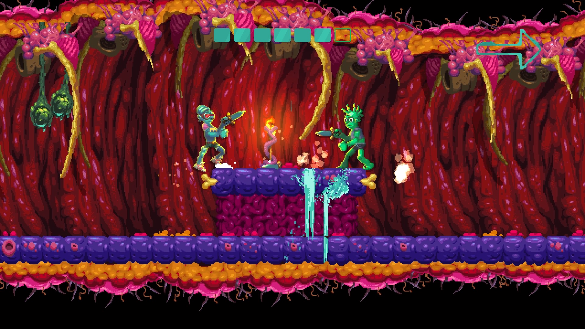Nidhogg 2 more than doubles the amount of stages from Nidhogg. Castle and Wilds return with a fresh set of textures while Clouds is completely revamped. Seven more are brand new. Volcano specializes lava-flow conveyor belts. Winter’s opening screen offers bobbing ice floats. The second segment of Swamps has the player entering a nidhogg, the third is travelling through its disgusting body, and the fourth (victory) screen subtly climaxes by ejecting the player from its butt hole. Fantastic.