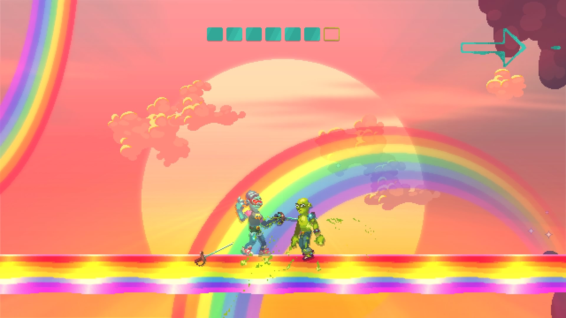 By default, all four weapons cycle with respawns. Sometimes opponents have the same weapons. Most times they don’t. Nidhogg 2 thrives in the juxtaposition, forcing players to improvise strategies or apply skill, all relative to the current environment. It’s worth noting that the playing field is usually covered in dropped weapons (and fluorescent blood), providing sufficient reason to pick up a temporary keepsake after you’ve throw yet another dagger into your enemy’s face.