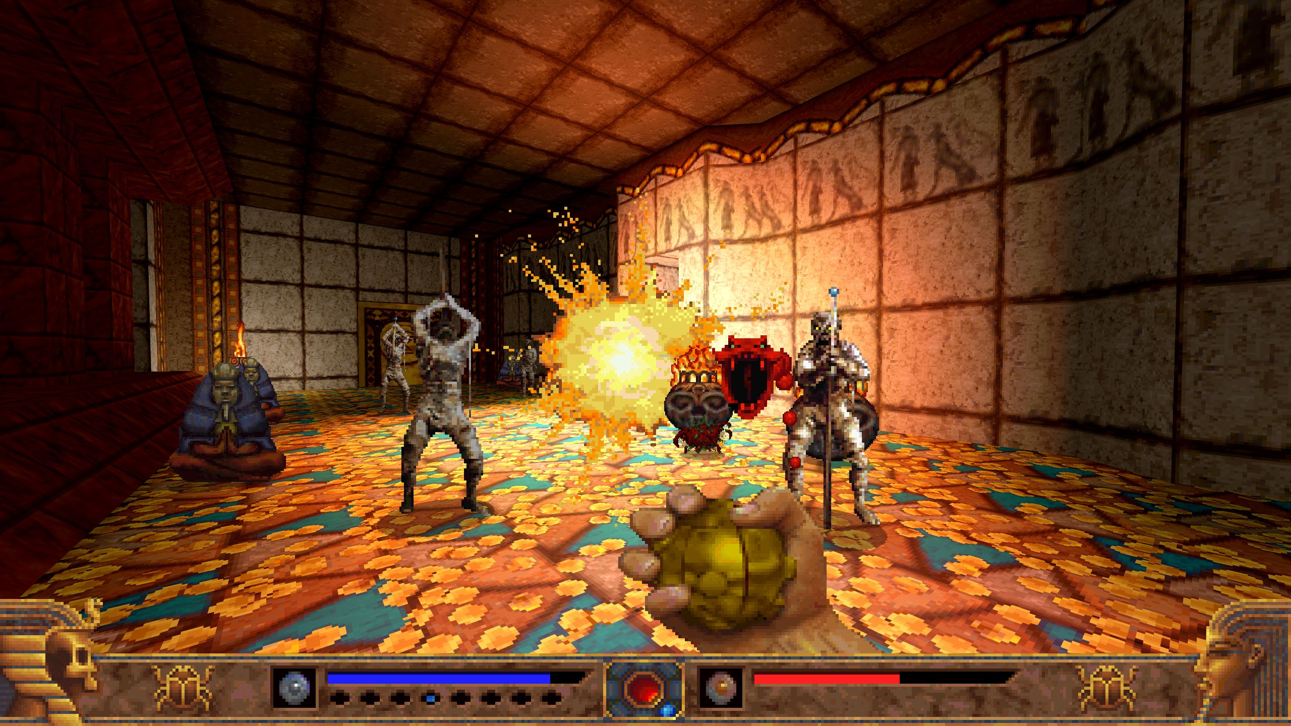 PowerSlave controls smoothly and supports motion control for looking around (which I disabled right away) as well as vibrations. A variety of adjustable options are there for you in the menu, most related to the graphics. Being KEX engine-powered, you have various SMAA anti-aliasing, anisotropic texture filtering options, CRT emulation, and a bunch more, not to mention support for 4K. There are a lot of optional knobs to turn there, but I was quite pleased with the defaults. I’ll also mention that I liked how bright the game was — I have vague memories of playing this on Saturn twenty years ago and playing it now on PS4, the latter seems so much brighter and with more ‘pop’ than ever, which was nice. The soundscape is great, and I would give a special nod to the soundtrack. Many of those 90s FPS games had outstanding soundtracks — take Heretic: Shadow of the Serpent Riders, Quake II, Duke, Doom, and others, for example — and PowerSlave does as well. The tracks in PowerSlave have a really nice Egyptian-vibe to them, reminding me of some of HeXen II, actually. Nicely done.