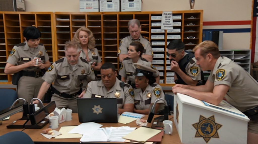 It’s been almost 20 years since Reno 911! premiered on Comedy Central with its mockumentary style look at the police officers of the Reno Sheriff’s Department. The show ran for six seasons from 2003 to 2009, then was revived on the streaming platform Quibi, a platform for short video clips in television show format designed to be viewed on smart phones. With the success of the seventh season on this platform, it was renewed for an additional eighth, switching to the Roku Channel when Quibi shut down. With a lot of different ways and methods to watch the show over the years, now, it’s all on Paramount+, including the newest film that has just been released on DVD, Reno 911!: The Hunt for QAnon.