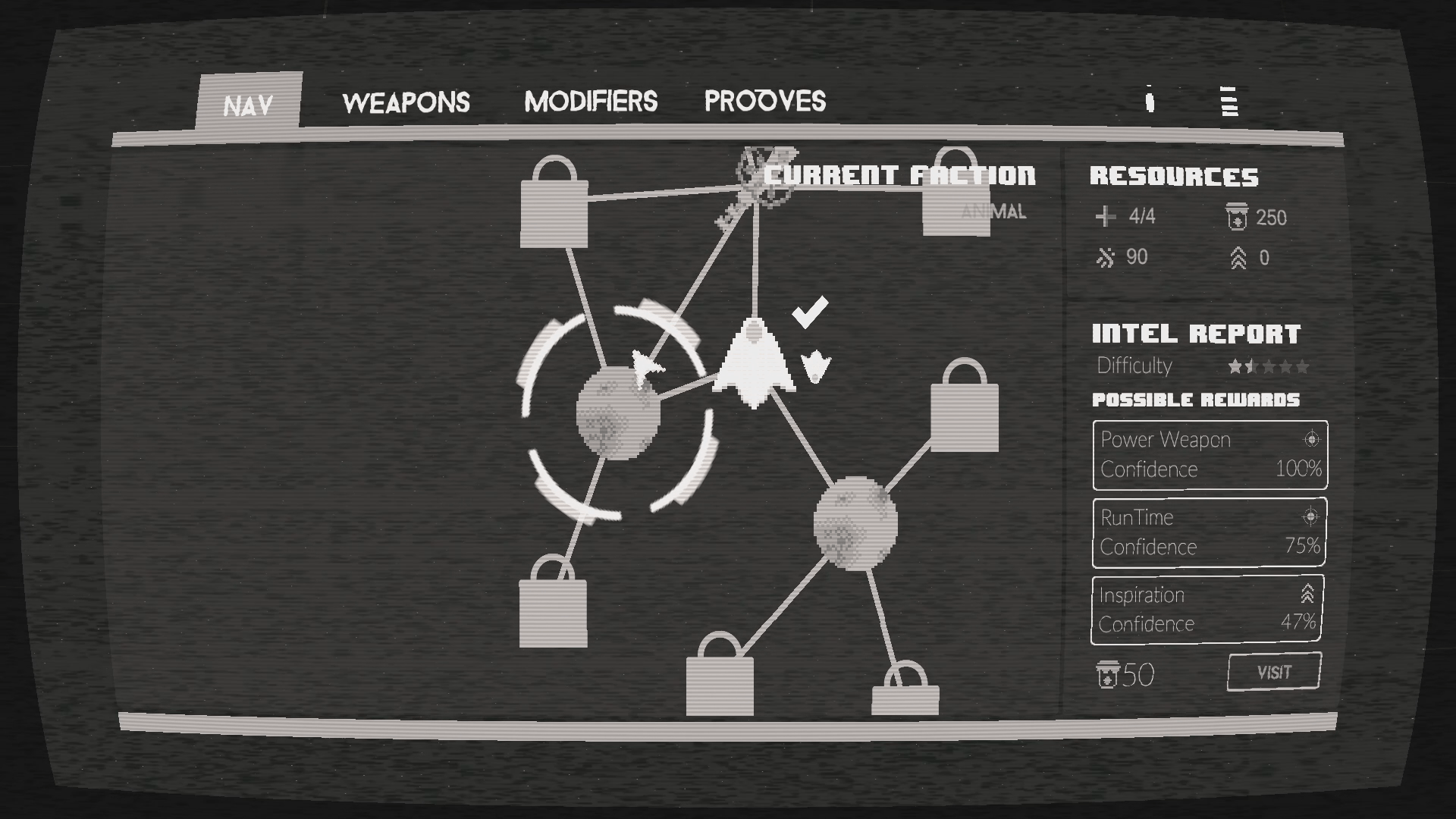 I was able to choose which level and subsequent rewards by spending Radar Jam (think action points), so that was nice. Having that power to determine my run’s path helped in gaining the currency and rewards I needed for advancement, so I didn’t feel that any given run was entirely out of my control. Roguelites often use variance to keep the gameplay loop refreshing, and RBA excels in giving the player a light degree of decisionmaking in a world where actions are made in exchange for jam. Once I ran out of jam, it was off to the first boss!