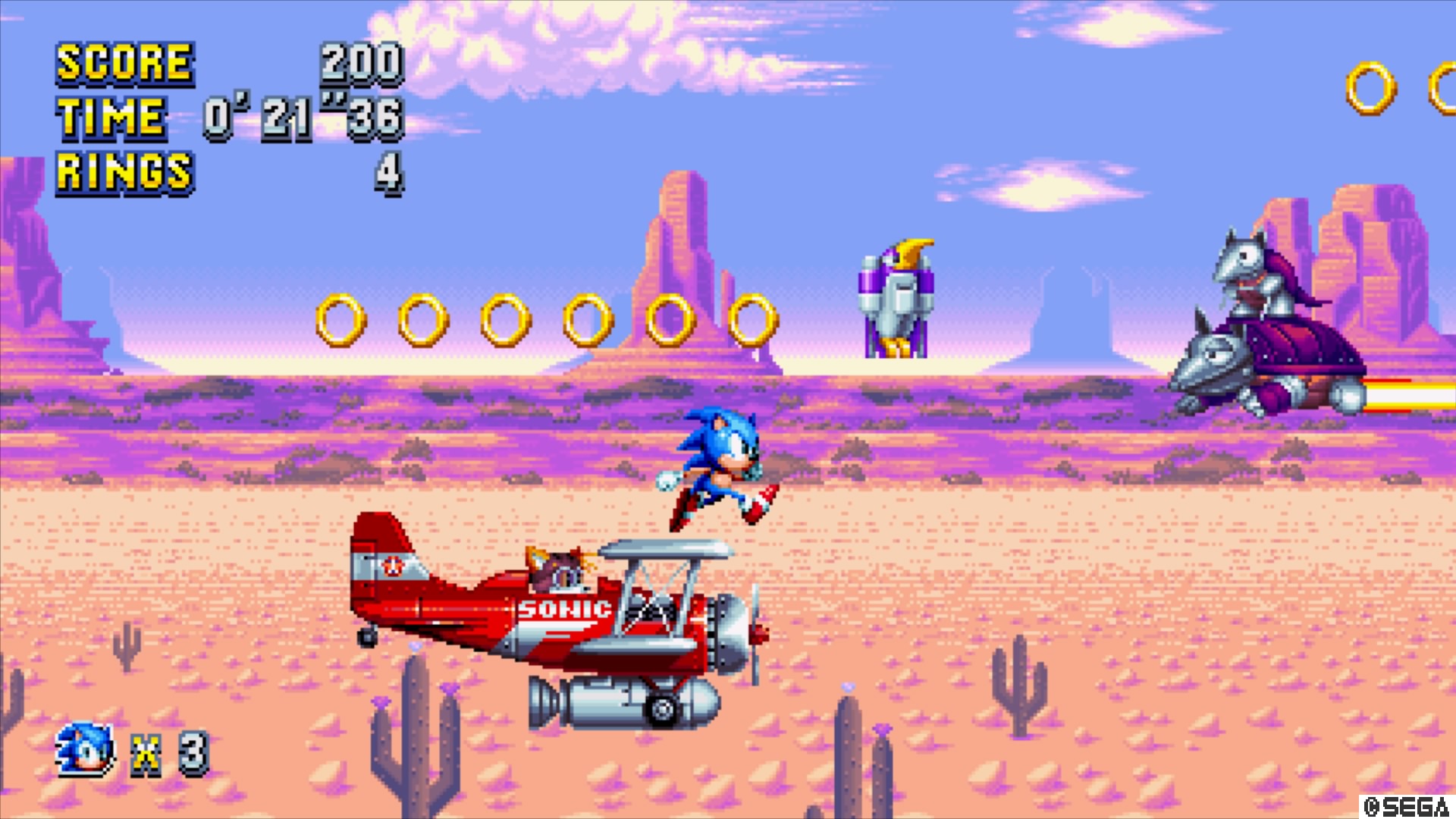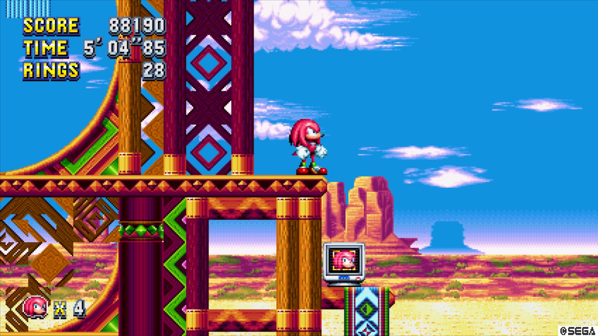As one might expect, Sonic Mania roars under the hood of its four original levels. The first act of Mirage Saloon (when playing as Sonic or Tails) is basically a horizontal shoot ‘em up with the trademark bi-plane the Tornado. The remainder compliments Act One’s western theme with ephemeral sarsaparilla pathways and disappearing, sandy speed loops. Studiopolis’ electric Hollywood theme features teleporting satellite vans, gravity loops, and silhouette tricks. Press Garden’s spin-friendly conveyer belts, tricky ice spikes, and Mega Man-inspired disappearing blocks feel like a frozen spin on Sonic 2’s Aquatic Ruin. Titanic Monarch, standing as Sonic Mania’s penultimate (but most challenging) zone, is rife with teleporting pink gas, momentum-demanding fling spheres, and what, in Act 2, essentially amounts to challenge rooms.