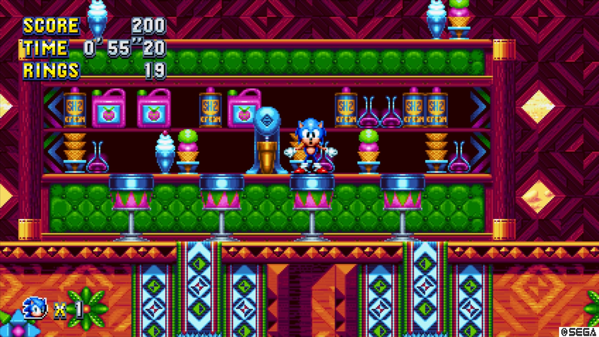 One of the benefits of fan games is the meticulous surge of obvious and oblique references. Translating minute obsessions to in-game references can be dangerous when infused to the point of alienating a casual (or ignorant) audience, but powerful when they’re able to slip by unnoticed. When you roll into the popcorn machine in Studiopolis you may think it’s a neat gimmick designed to toss Sonic around in the air. You may not know that it’s also a C-2 1993, SegaSonic Popcorn Shop, an AM1 popcorn/arcade machine exclusive to Japan.