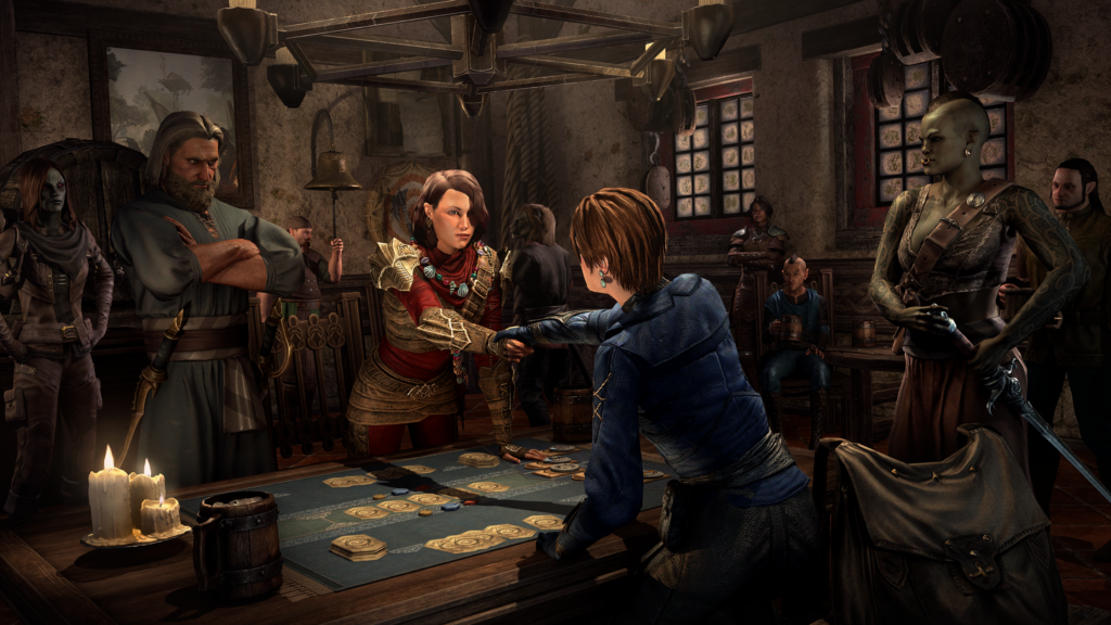 One big, and quite welcome, addition to The Elder Scrolls Online is Tales of Tribute. This new card game is a welcome reprieve from the errand running and battles of the quests. There is a building on the coast in Gonfalon Bay that houses the local chapter. There you will meet with Brahgas, a wood elf Tales of Tribute player. He introduces you to the game and will teach you the ropes.
