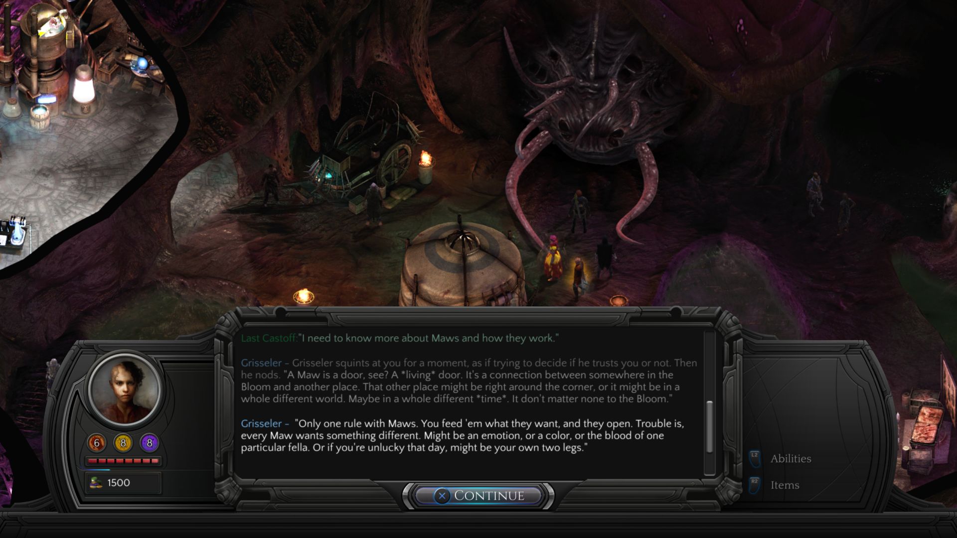 You might expect a learning curve too, or at least there will be for the genre-uninitiated like myself. Controls are responsive and game mechanics largely make sense when they’re first introduced, but when I mentioned being nearly overwhelmed earlier with the game’s choices and depth, that was no joke. The amount of character classes and types and stats felt kind of grind-y and a barrier to my investment into the game. I was worried I would make the wrong decisions and get deep into the game only to get stuck and frustrated. Fortunately, that has not been the case. Typically I’ll favor mage like characters, which is what I did here, but with stats also favoring a convincing tongue, you can often talk your way around bad situations. Even when you find yourself in crisis, or Crisis rather as they’re called in-game, you can find alternate ways out of battle. I much preferred this route as turn-based RPG combat is still something I typically loathe, in no small part because I don’t put forth the patience and effort to strategize. So having that option to find an alternate path out of the Crisis was welcomed, and, at least in my experience, the Crisis moments are not all that common anyway. Beware of The Sorrow, though; this vicious, relentless, tendril-swinging monstrosity (sounds like I’m describing Venom, ha) exists solely to hunt you and the other Castoffs down and kill them. As a Castoff — a spawn of an entity known as the Changing God — your place in the Ninth World is undesirable to The Sorrow and a violation of the balance. You’ll spend a great deal of time figuring out who you are, how you got here, and many other soul-searching and developing questions, while fending off the assaults of The Sorrow.