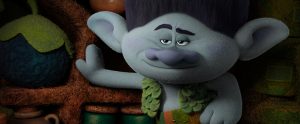 Well . . . almost everyone. Branch (Timberlake) does not fit in with his fellow trolls. He is a washed-out gray hue, doesn’t sing, and certainly doesn’t hug. Unlike those around him, Branch is preparing for the inevitable day when his kind while again face the Bergens. He issues warnings that the Trolls should be more mindful of their surroundings and should not party quite as loudly as they do. His warnings are dismissed.