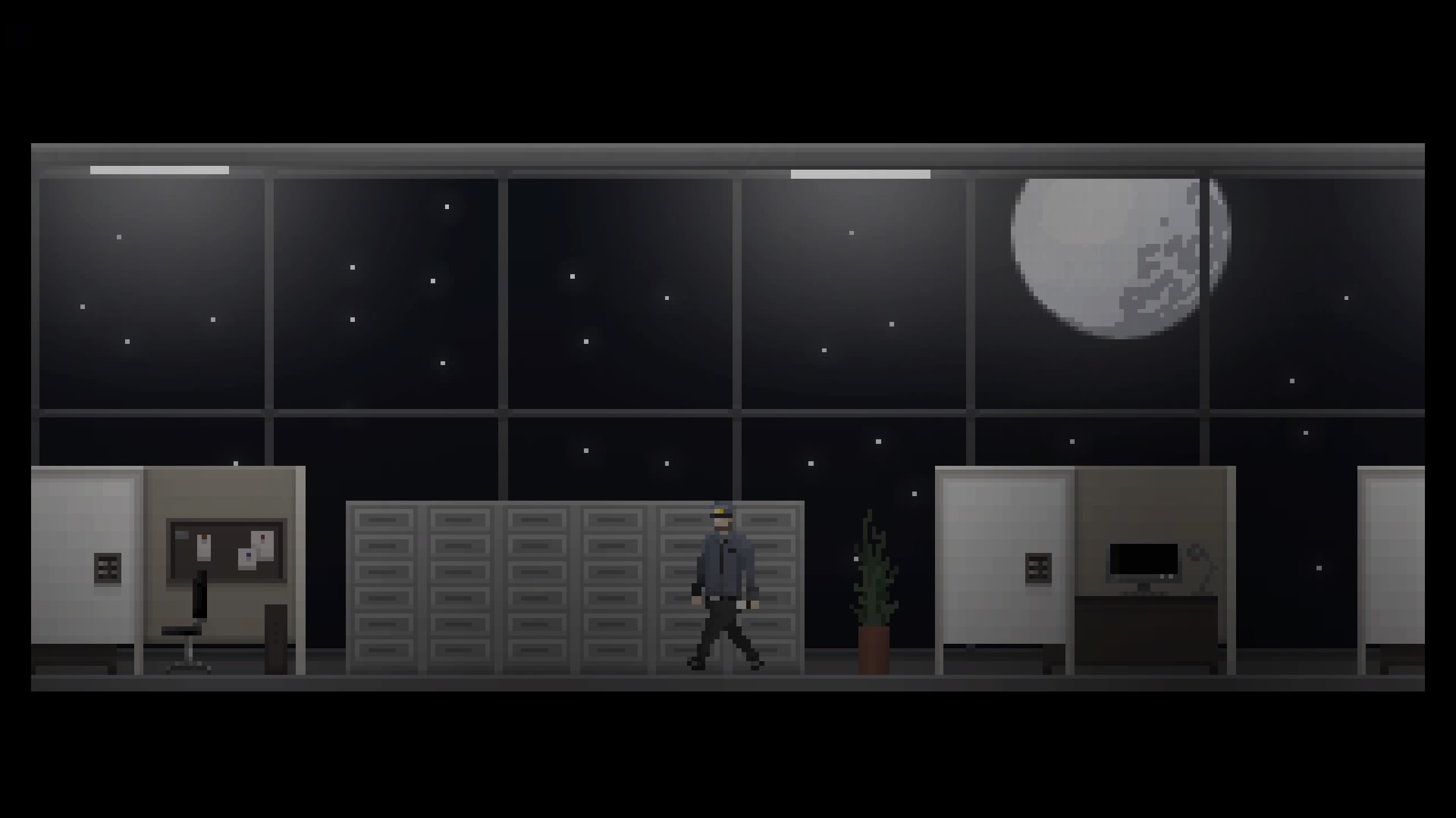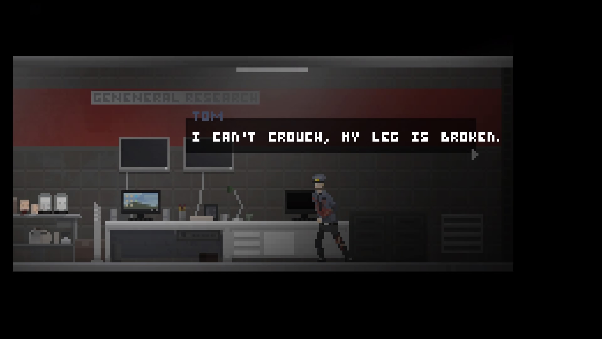Indulging in the deeper conspiracy is intended to drive the player forward. At this point, Uncanny Valley transforms from an unsettling but leisurely investigation to a strict 2D stealth game. Tom must stay out of sight of prowling horrors, usually by walking behind bookshelves or desks. If one catches up to Tom it will maim a body part before briefly shutting down. If whole mob is present Tom is probably going to die and Uncanny Valley will come to an end.