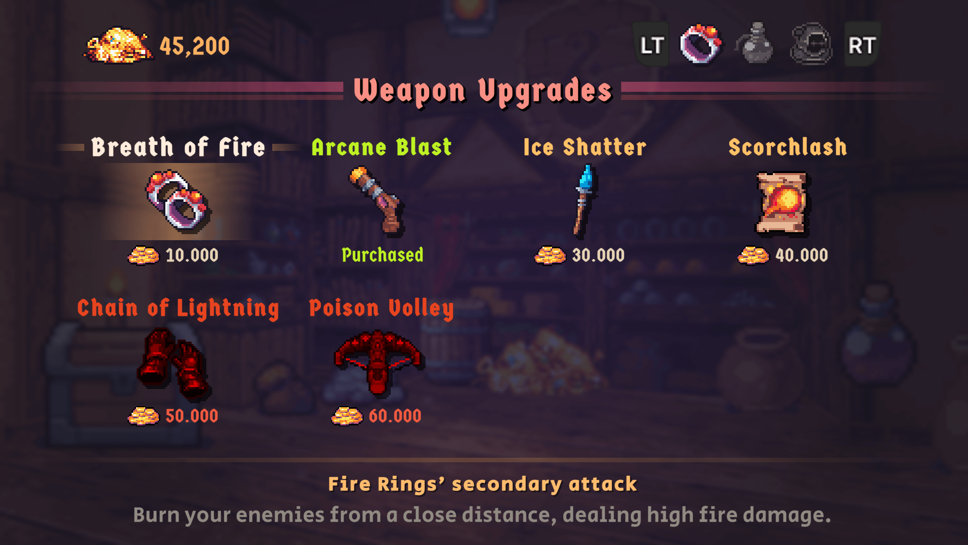 The other major addition to Episode 2 is the Sorcerer’s Shop. Currently, finishing a level takes me to a new screen where I can spend the currency I’ve acquired thus far from slaying weapons and uncovering secrets on the weapons’ alternative attacks!