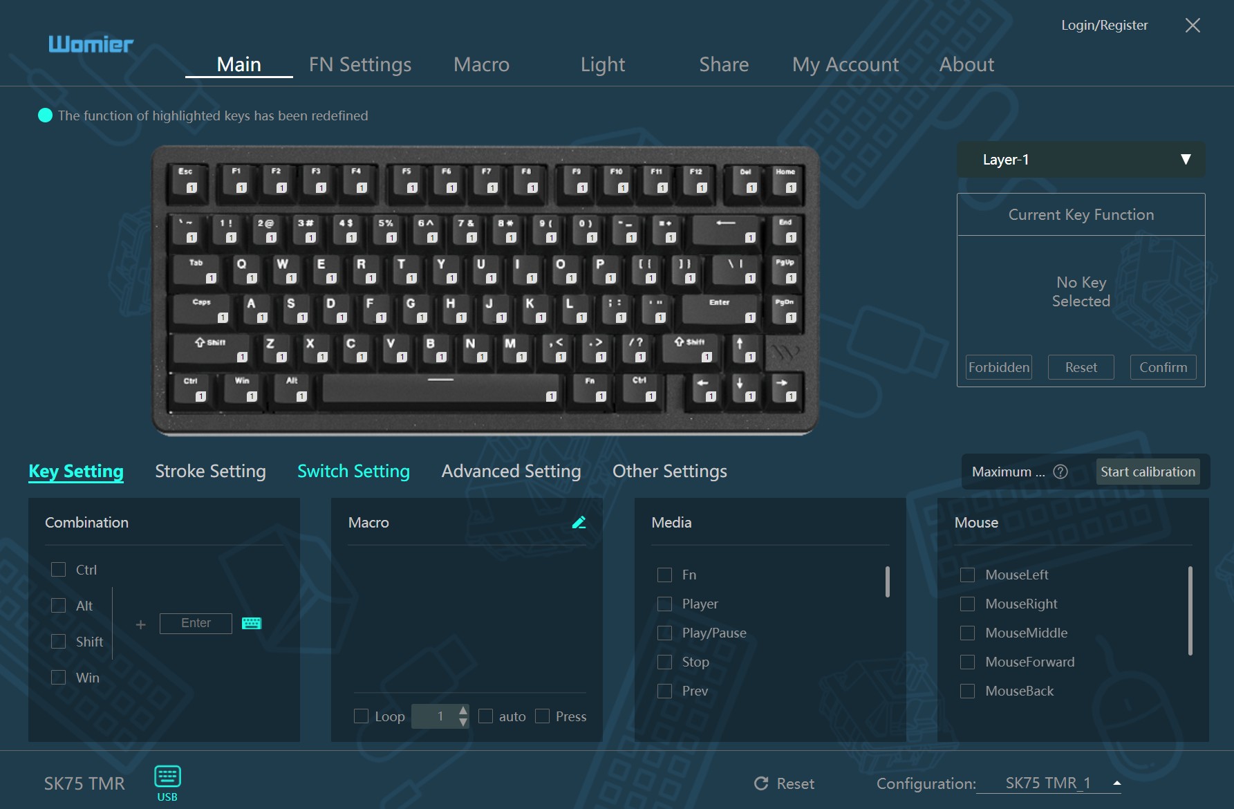 Now, climbing down from my keyboard high-horse, the SK75 TMR’s software is extraordinarily easy to install, navigate, understand, and use. When you install the software for the SK75 TMR, the main window that appears contains nearly all you want to take full control of your keyboard experience. If you wanted to create macros, you could do so from this window. If you want to adjust your stroke or switch settings, then they’re right on the same page. It’s a simple page with easy-to-find options. I love that about this software, and I wish more companies would go along with this design. It’s an HCI dream.