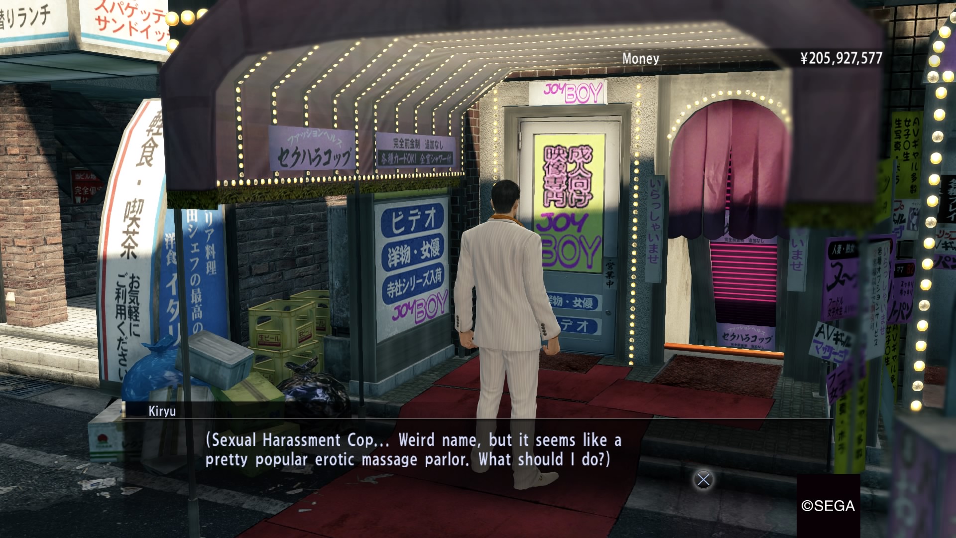 Exceptions are present, mostly in the form of facets of urban Japan that have either been replaced by an evolution of culture or technology. Which, of course, means I’m talking about weird sex stuff. Telephone club, where Kiryu can call a girl from a hotline and setup a date/love hotel meetup, may accidentally be a stirring analog for Tinder. There’s also the porn theater, where Kiryu and Majima can watch and (presumably) off-screen masturbate to videos of short, softcore videos of idols playing with balloon animals or smiling on a bed. These are definitely out of line with 2017’s progressive stance on women and gaming but simultaneously a cultural artifact locked into an appropriate time period. It’s fine? It’s fine. It’s good that it’s there, and that Yakuza 0 avoided Yakuza 3’s issues with content removal.